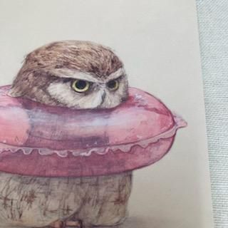 山根さんの新作ポストカードはうきわに入ったふくろうさんです