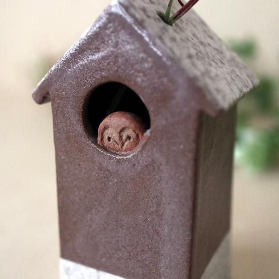 家型で丸窓から顔をだすメンフクロウがキュートな一輪挿しです。