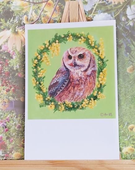 満開ミモザのポストカード。満開のミモザに囲まれているフクロウをポストカードにしたものです。ぜひ春の便りを書いて知人、友人に送ってみてはどうでしょうか?