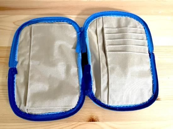 左側にじゃばらポケット×2、右側にカードポケット×4、小ポケット×1、大ポケット×2、真ん中にゴムのペンホルダーとポケットがいっぱい。
