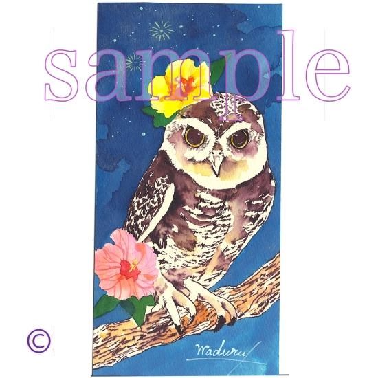 ハワイの夜景、インドコキンメにハイビスカスを飾りハワイアンな絵となっています。