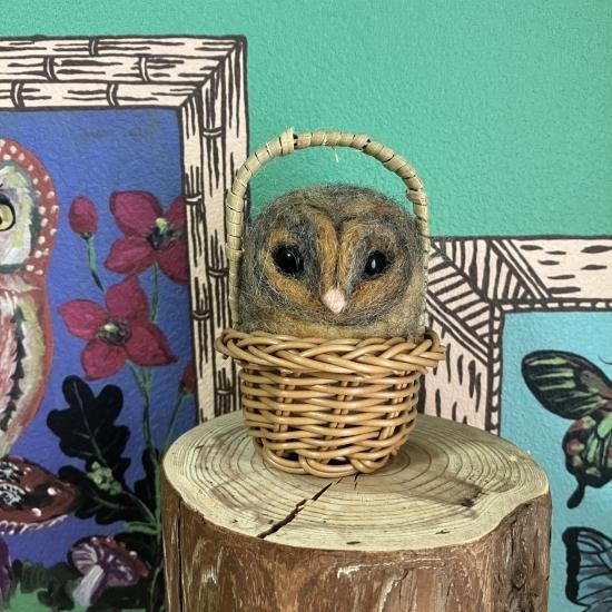身長9cm程の小さいカゴに入ったブラックメンフクロウです。