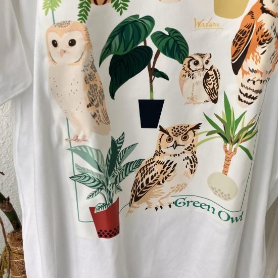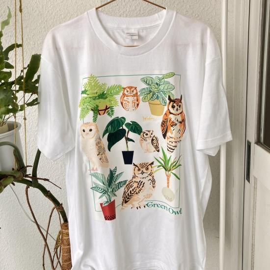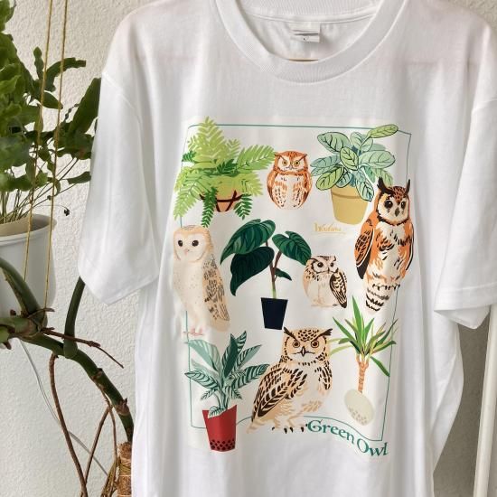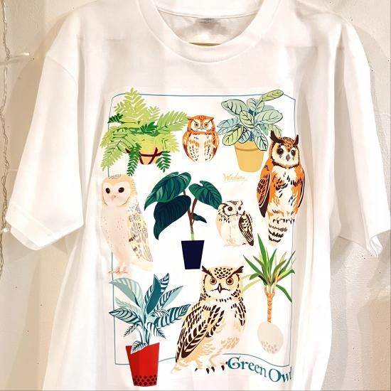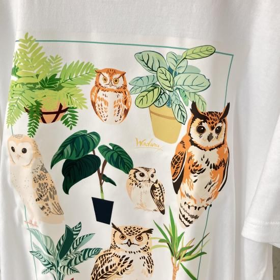 様々なフクロウと植物が集まったデザインのTシャツ。春の散歩にぜひ来て出掛けてはいかがですか?
