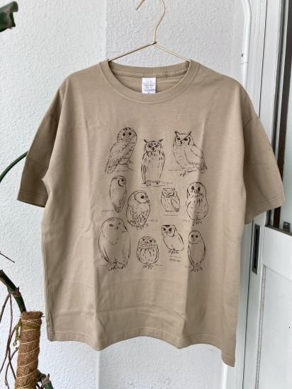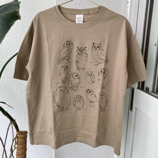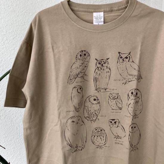 奥谷ファブリック ビッグシルエット Tシャツ 『ふくろうフクロウ』サンドカーキ S.L.XL