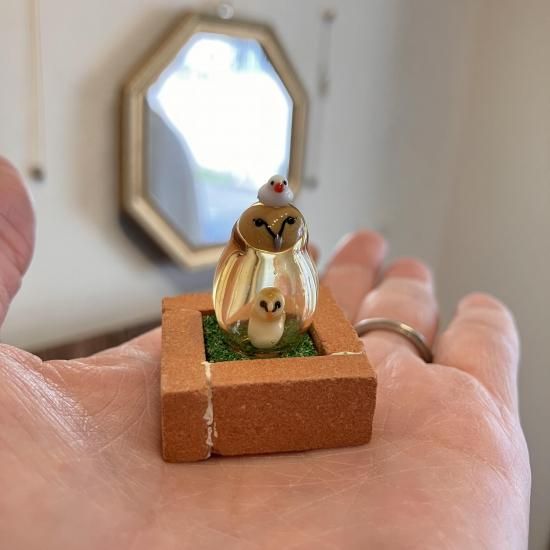 吹きガラスでつくった空洞のフクロウの中に小さなフクロウが入っています。頭の上には文鳥がいます。