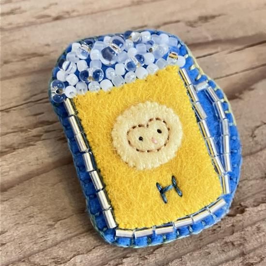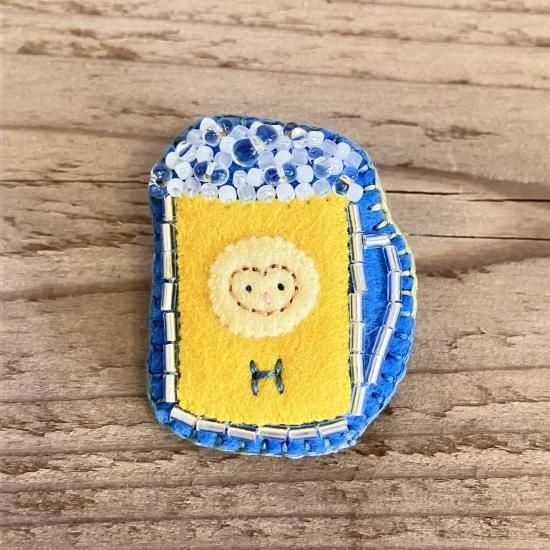 ジョッキになみなみと注がれたメンフク印のビールブローチ。