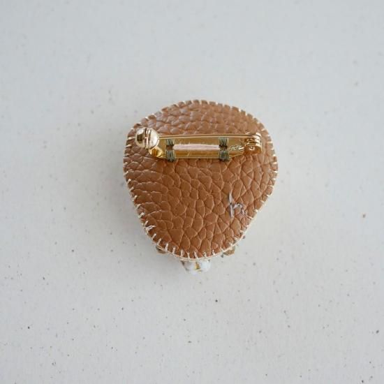 上品な煌めきのラメ糸で縁かがりをし、回転ピン式のブローチ金具をつけています。