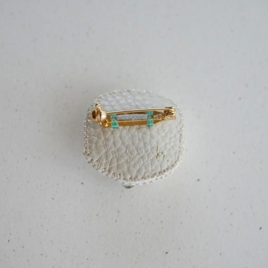 上品な煌めきのラメ糸で縁かがりをし、回転ピン式のブローチ金具をつけています。