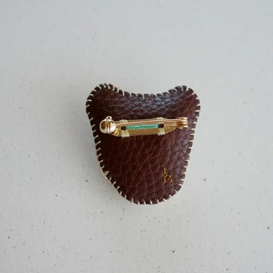 上品な煌めきのラメ糸で縁かがりをし、回転ピン式のブローチ金具をつけています。