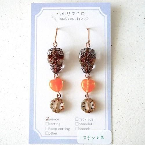 ハルサクイロ ファンシーふくろうチェコ茶ピアス(金具ピンクゴールド色)