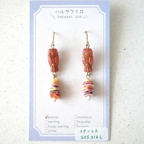 ハルサクイロ ふくろうチェコピンク貝つなぎピアス(金具ゴールド色)