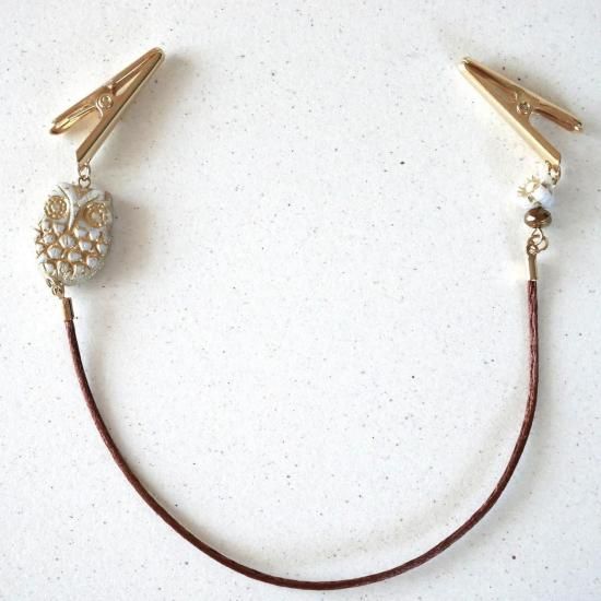 ハルサクイロ ふくろうチェコビーズのストールクリップ フラットふくろう(白ゴールド×茶コード)