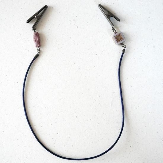 ハルサクイロ ふくろうチェコビーズの帽子クリップ ふくろうチェコ(紫×コード色ネイビー)