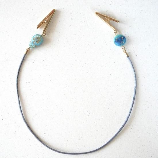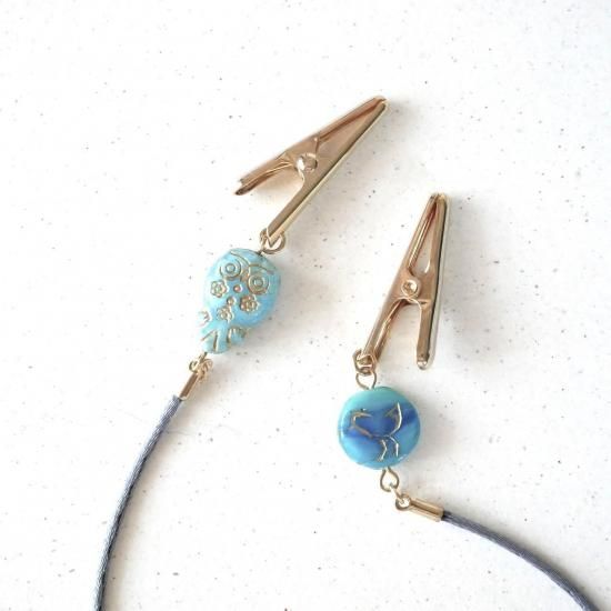 ハルサクイロ ふくろうチェコビーズの帽子クリップ ファンシーふくろう(水色×コード色グレー)