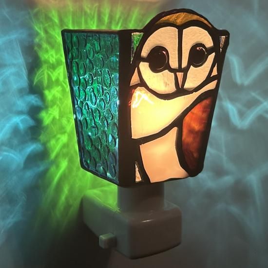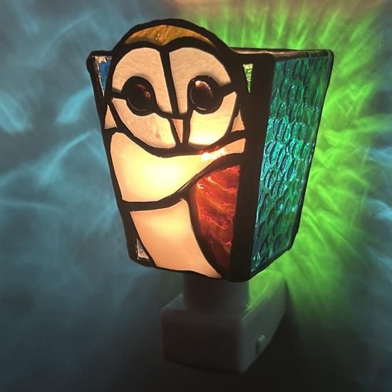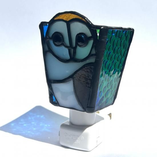 メンフクロウ・インドコキンメフクロウ・ベンガルワシミミズク・アフリカオオコノハズク・メガネフクロウの5種類を今回は製作しました。1つのナイトランプでガラスのパーツ全19パーツ以上のアートガラスで構成されています。1点1点個性ある表情、闇夜に灯りをつけると翼を広げた様に光の波紋が壁に広がります。この作品で心を癒していただければ幸いです。