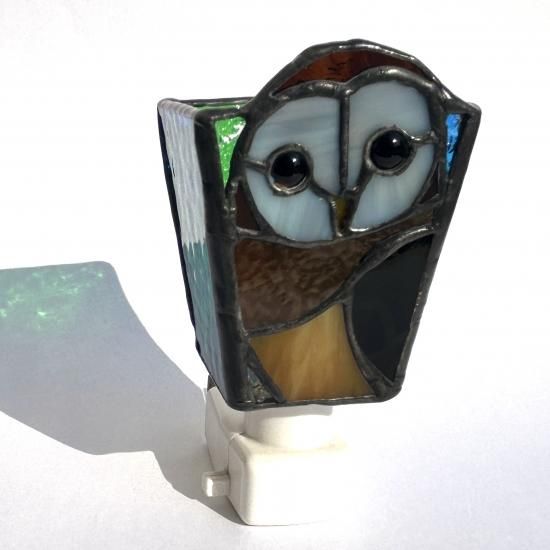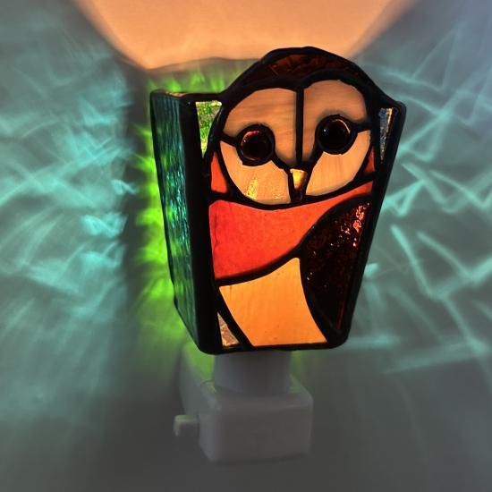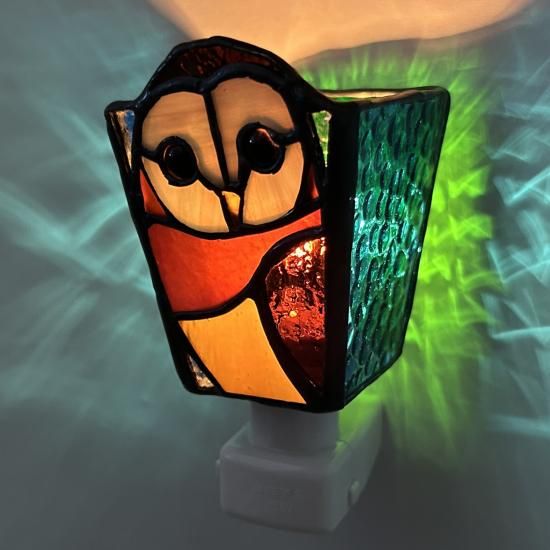 メンフクロウ・インドコキンメフクロウ・ベンガルワシミミズク・アフリカオオコノハズク・メガネフクロウの5種類を今回は製作しました。1つのナイトランプでガラスのパーツ全19パーツ以上のアートガラスで構成されています。1点1点個性ある表情、闇夜に灯りをつけると翼を広げた様に光の波紋が壁に広がります。この作品で心を癒していただければ幸いです。