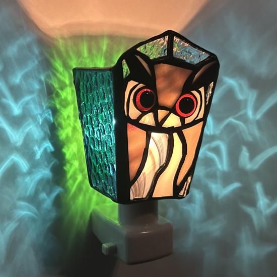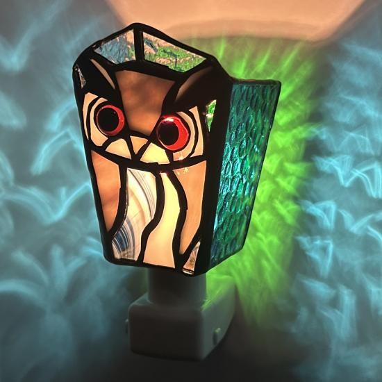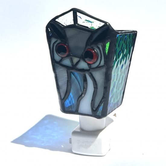 メンフクロウ・インドコキンメフクロウ・ベンガルワシミミズク・アフリカオオコノハズク・メガネフクロウの5種類を今回は製作しました。1つのナイトランプでガラスのパーツ全19パーツ以上のアートガラスで構成されています。1点1点個性ある表情、闇夜に灯りをつけると翼を広げた様に光の波紋が壁に広がります。この作品で心を癒していただければ幸いです。