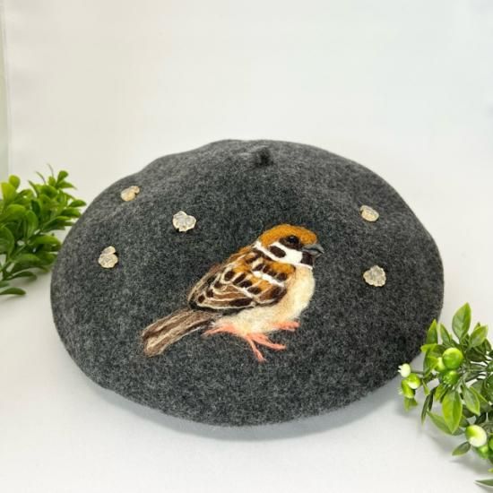 水仙舎 羊毛刺繍ベレー帽 スズメ(濃いグレー)