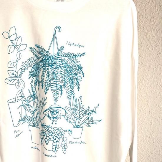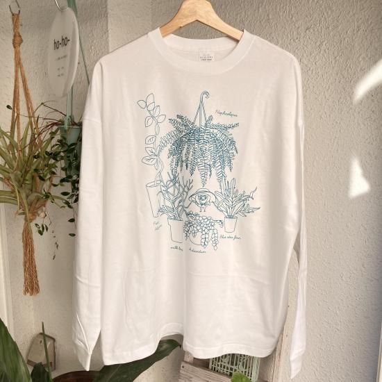 奥谷ファブリック BIGシルエットロングTシャツ 『観葉植物とミーちゃん』 ホワイト×ブルーグリーン