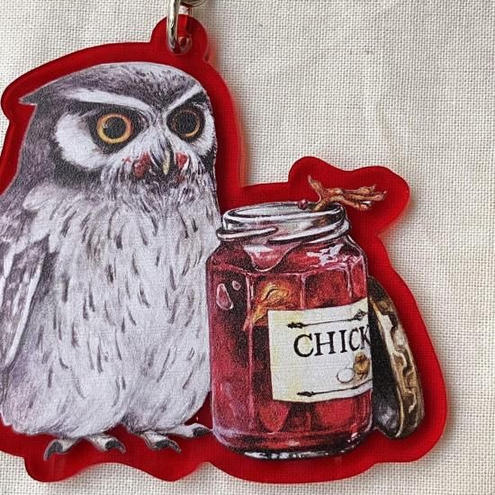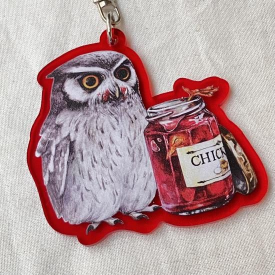 アフリカオオコノハズクとヒヨコジャムのシュールなアクリルキーホルダーです。